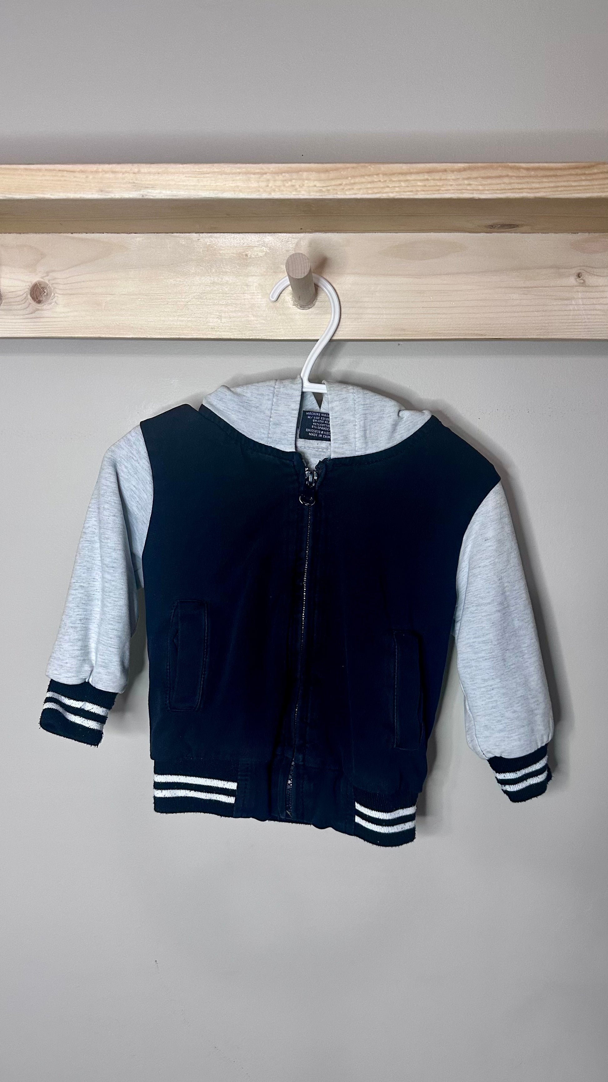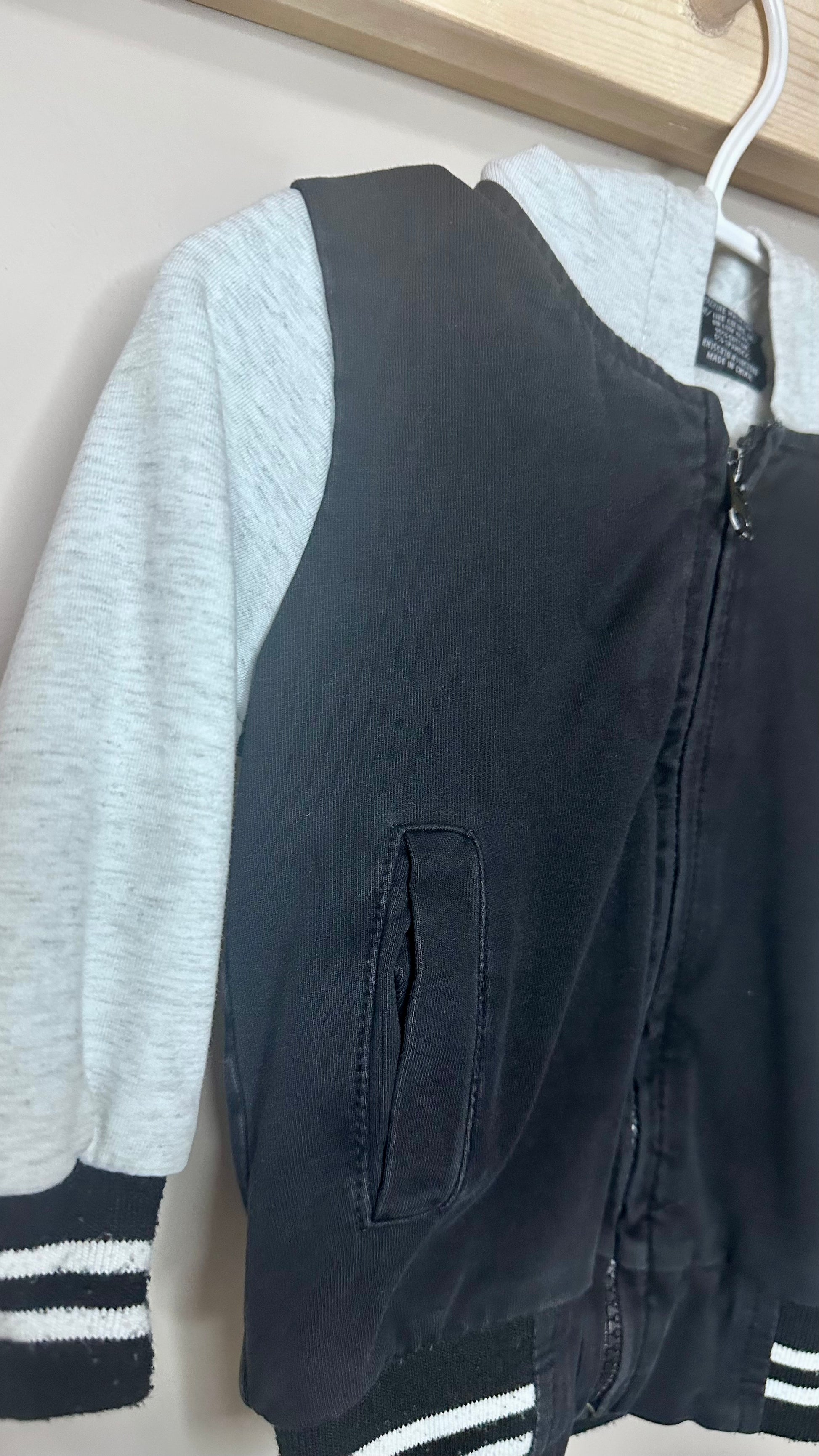 Stain on front by zipper. Small hole on under sleeve.